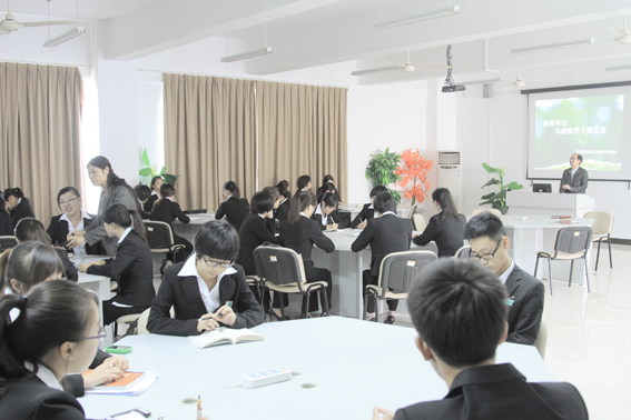 首先,在班主任牟老师的介绍与同学们热情的掌声中,王书记对进入邮储订单班的同学们进行了祝贺,寄予了厚望,同时也提出了期望和要求。王书记与同学们进行了互动性很强的零距离交流,交流模式主要由同学们提问、书记为之解答困惑的方式进行。班长代表全班同学提了两个建设性的问题,书记非常耐心地解答。王书记在解答过程中,特别强调了要提高金融职业技能水平、培养与人沟通交流的能力等方面提升自身职业素质和职业素养。同时,在学习之余,还要培养个性、发展优势,为今后工作打好基础。作为有志进入邮储工作的银领学子,在即将走出校门之时,更要关注自身成长,身身素质的提升。