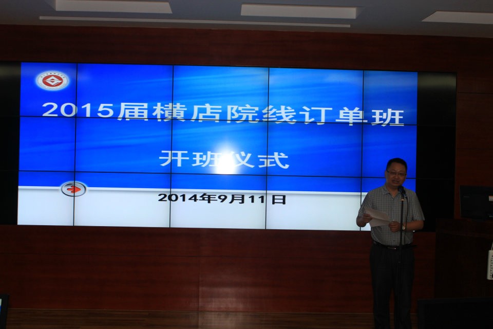 2014年9月11日下午,云顶国际vip.8882015届横店院线订单班开班仪式在光大教学楼9205教室隆重举行。云顶国际vip.888党总支书记、副经理王祝华,横店电影院线有限公司办公室主任兼人力资源部部长黄刚、办公室主任助理马军、职业培训中心主任姜玉玲等领导出席,横店院线订单班全体同学参加。开班仪式由横店院线订单班班主任孙淑萍老师主持。