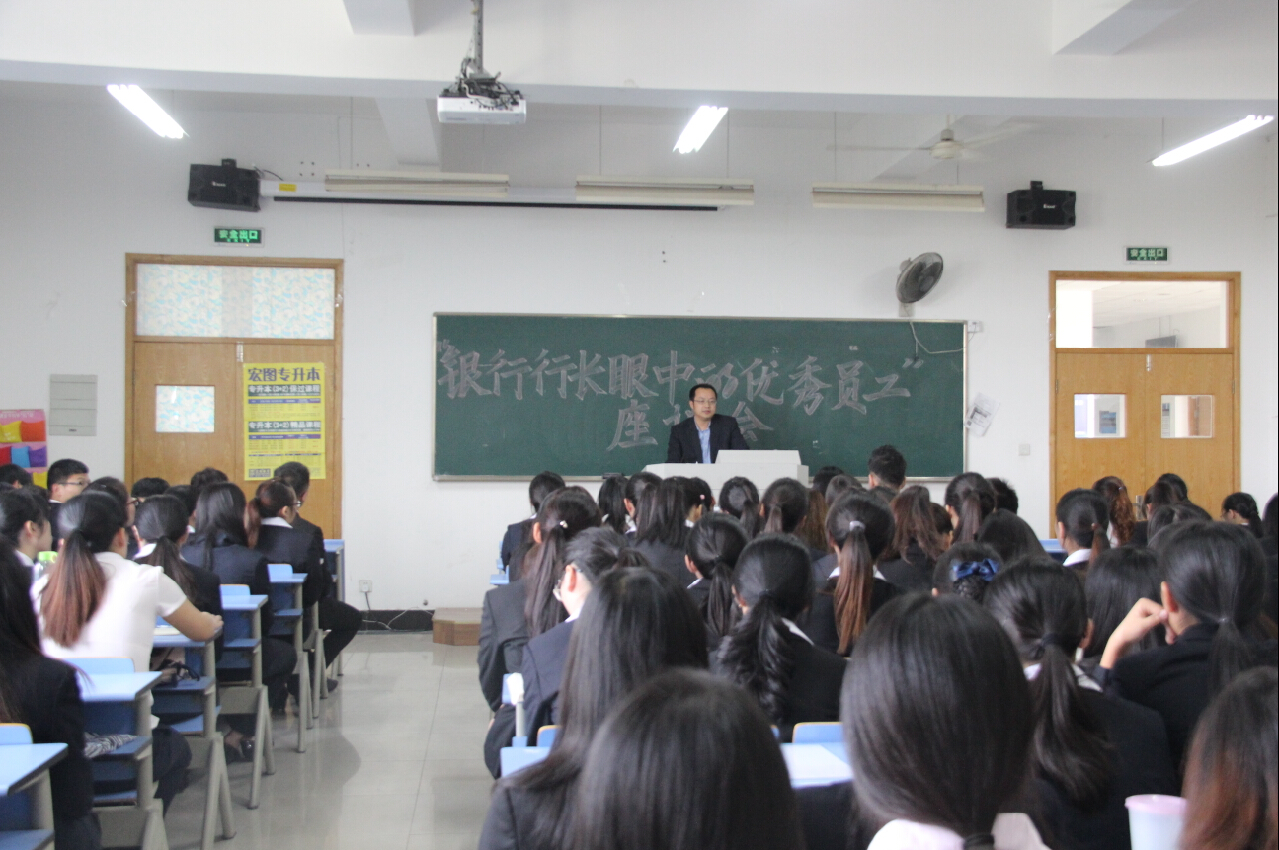 银行需要什么样的员工?行长眼中的优秀员工要达到哪些标准?如何成为银行的优秀员工?为了帮助同学们更好地了解银行要求、更加快速地成长为优秀的银行员工,2014年10月15日14点,云顶国际vip.888在9320教室举办了“银行行长眼中的优秀员工”讲座。本次讲座的主讲人是中国银行金华市分行副行长袁鹰,出席讲座的有云顶国际vip.888党总支书记、副经理王祝华,辅导员章甜甜以及云顶国际vip.888部分银行订单班成员,讲座由王祝华书记主持。