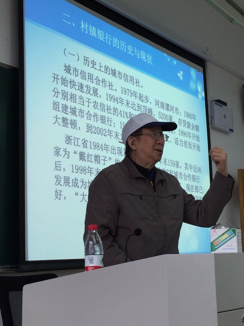 年逾古稀的应教授活泼、爽朗,刚走进教室就赢得同学们的热情欢呼。整场讲座,应老避免形而上的笼统、晦涩,以幽默、风趣的语言,结合其自身对村镇银行的广泛调研和深入研究,从“性质、历史、现状、前景”等四个方面对我国村镇银行进行了全面分析。应教授分析指出,村镇银行作为县域小型商业银行,其核心目标就是——小客户大市场,小银行大未来。他指出,我国村镇银行起步较晚,其决策链短,资本金少的特点决定了服务小微客户的优势。应教授鼓励银领学子在新的领域开疆拓土,希望联合村镇银行订单班全体同学通过自己的努力快速成为骨干力量。