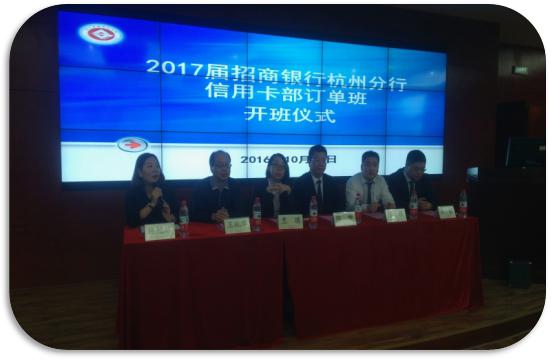 2016年10月12日下午15:30时,云顶国际vip.888招商银行杭州信用卡部订单班在光大教学楼9205教室举行开班仪式。招商银行杭州信用卡部综合室主管徐峰、市场推广室主管陈琪、商务合作室主管孟淇、培训老师王喆一行专程出席,云顶国际vip.888党总支书记、副经理王祝华,班主任林艳琼,以及35名订单班全体员工参加了此次开班仪式。会议由林艳琼老师主持。