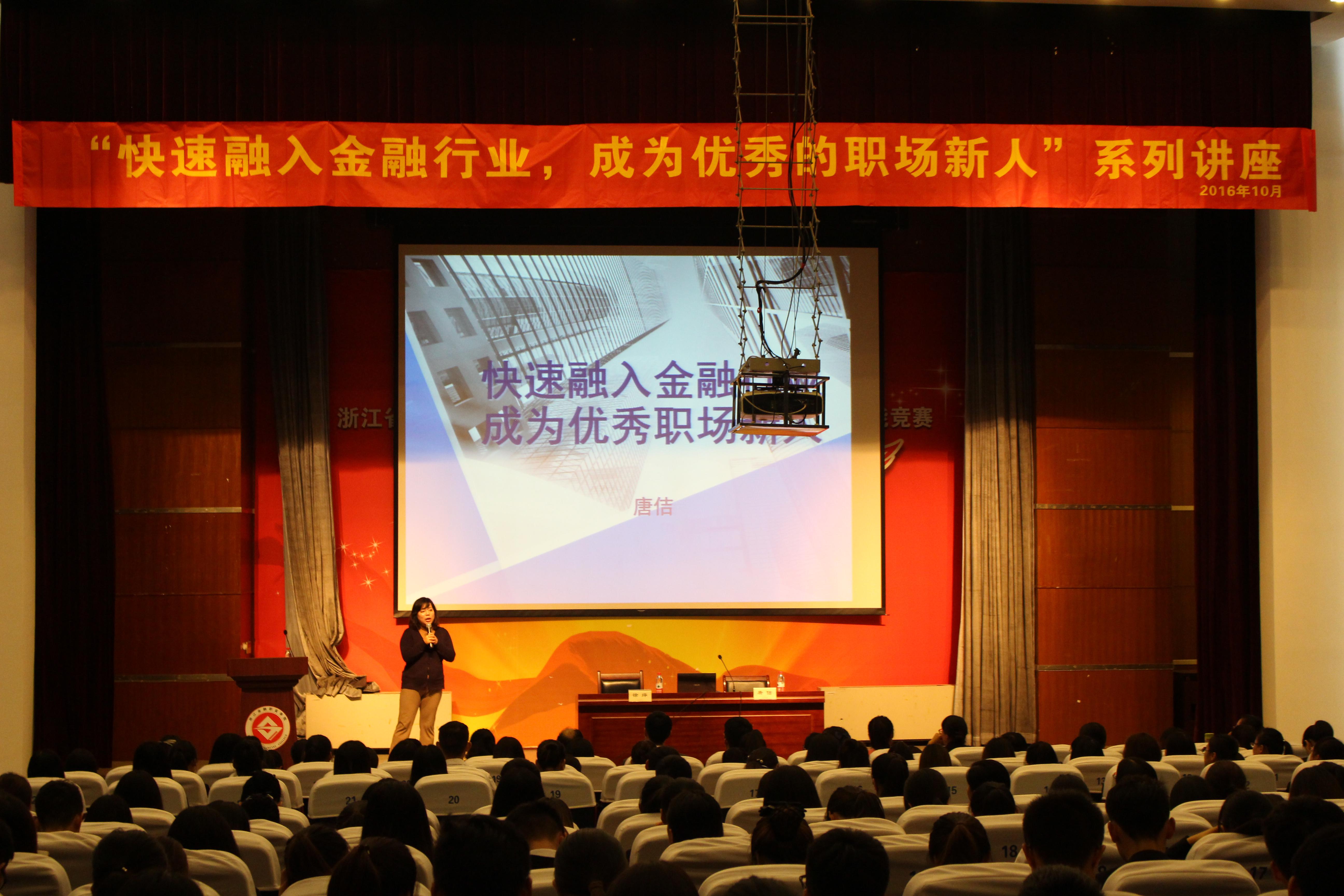 10月18号,一场秋雨一场寒,但延绵的细雨丝毫未阻挡500多名银领学子求知的渴望,偌大的明理报告厅座无虚席,他们身着正装,翘首企盼北京融睿诚通金融服务外包有限公司董事长唐佶女士的到来,聆听一场别开生面、零距离接触职业事业的讲座。银领公司党总支书记、副经理王祝华,职业素质教研室副主任徐烨,银领公司辅导员章甜甜、徐珍珍也出席了本次讲座。