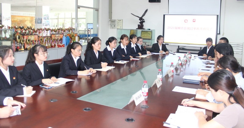 9月16日下午,2021届横店影视股份有限公司订单班开班仪式在9#118会议室举行。横店影视股份有限公司人力资源部部长楼张旭、人力资源部主管陈丹萍、人力资源部蔡建成,云顶国际vip8866云顶国际vip.888党总支书记、常务副经理邵月花、党总支副书记蒋赟、办公室主任沈建锋、学工办主任章甜甜、订单班主任孙淑萍出席本次开班仪式。
