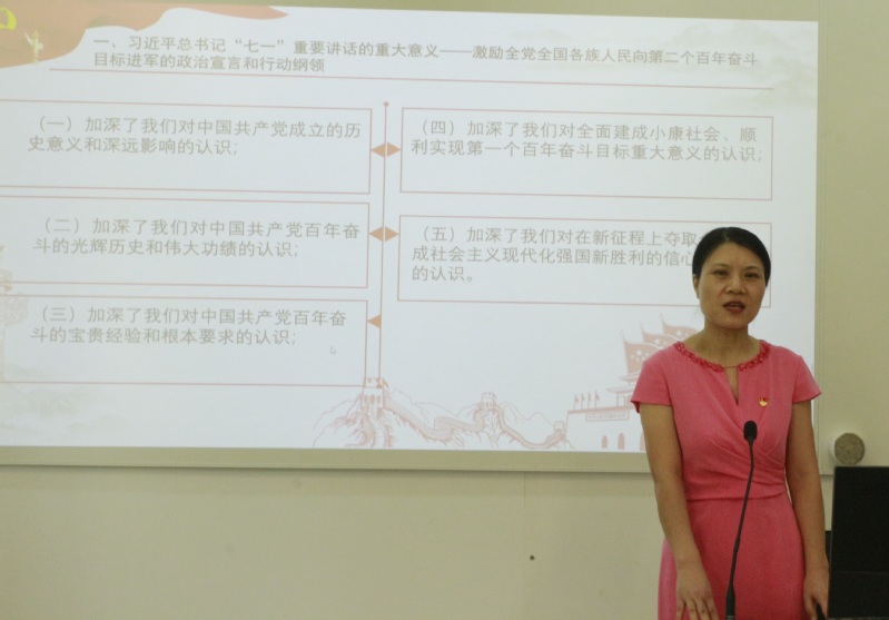 蒋赟以《把学习贯彻习近平总书记重要讲话精神作为一项重要的政治任务抓紧抓好》为主题讲授党课。她在党课中介绍指出,习近平总书记“七一”重要讲话,以五个“庄严宣告”,体现本次讲话的重要时代意义;以32个字,概括党的精神之源;以86次提“人民”,展现本次讲话饱含的深情;以九个“必须”,反复强调以史为鉴、开创未来;以三个“和”,诠释中国共产党的天下情怀;以三个“不变”,宣示党的坚强决心;以三个“绝不”,彰显党的坚定信念;以一个“号召”,对每一个共产党员提出希望和要求;以三个“不负”,对青年寄予厚望;以四个历史阶段,为百年史诗“划篇章”;以三个“一切”,归结为一个主题;以两个“万岁”,讴歌中国共产党的伟大与光荣。她指出,全体党员把学习习近平总书记“七一”重要讲话精神作为当前和今后一个时期的首要政治任务,精心安排部署,周密组织实施,不断丰富学习形式,深刻领会和把握讲话的重大意义、丰富内涵、核心要义、实践要求,切实把思想和行动统一到习近平总书记“七一”重要讲话精神上来。