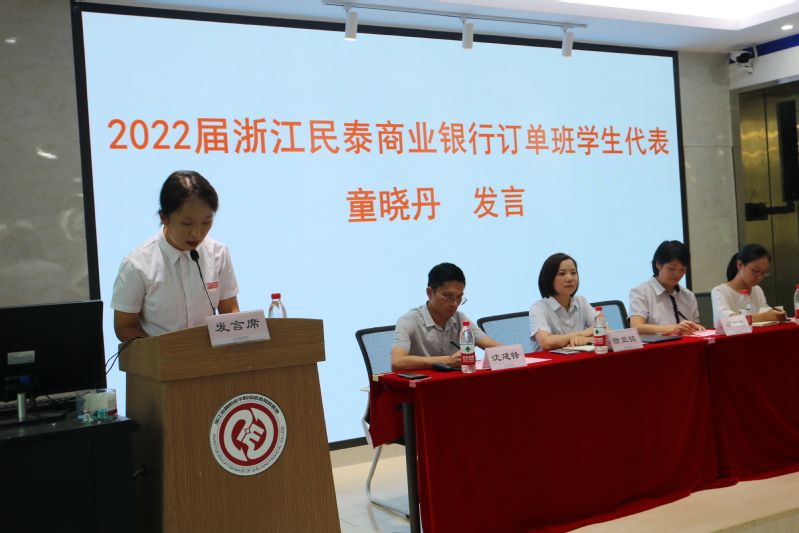仪式上,订单班员工代表童晓丹浙江民泰商业银行和公司领导表示感谢。她表示全体同学一定不会辜负领导老师的厚望,会在银领学习的一年中,提高沟通表达能力以及自身的综合素质,以更优秀的状态进入浙江民泰商业银行工作。