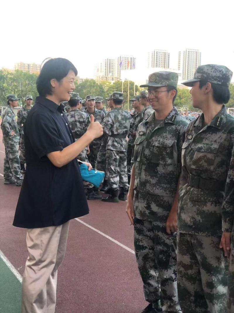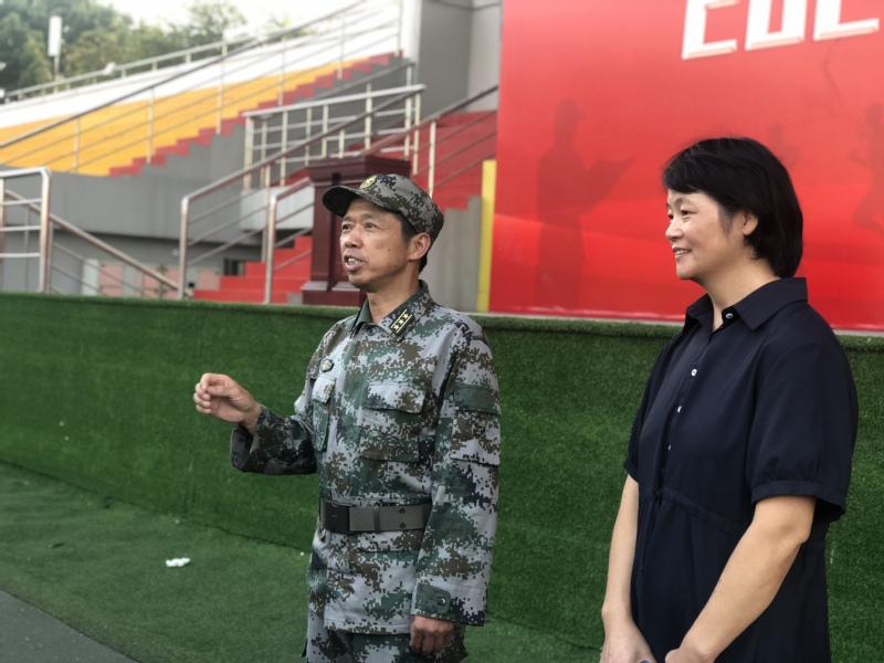 9月27日下午,云顶国际vip.888党总支书记、常务副经理邵月花来到华夏运动场军训现场,看望慰问云顶国际vip.888承训的18名教官,辅导员杨斌英陪同。
