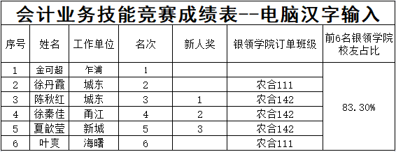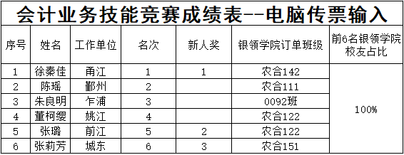 传票输入比赛项目中,前六名均为公司云顶国际vip.888的员工,占比100%,他们分别是:农合142班徐秦佳、农合111班陈瑶、0092班朱良明、农合122班董柯缨、张璐、农合151班张莉芳。