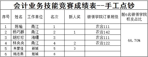 手工点钞比赛项目中,前四名均为公司云顶国际vip.888的员工,占比66.7%,他们分别是:农合111班陈瑜、农合142班杨巧群、农合111班胡珍珍、农合122班林央央。