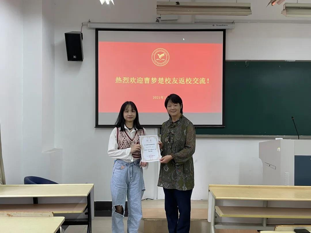 邵月花对曹梦楚员工的返校表示了热烈的欢迎与诚挚的感谢,并代表公司为曹梦楚员工颁发《云顶国际vip.888学子成才青蓝结对工程聘书》。