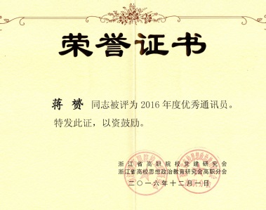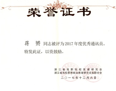 副岗长蒋赟长期服务于浙江省高职院公司党建研究会学术委员会副秘书长工作,担任《党建通讯》编辑,连续三年被授予“优秀通讯员”称号。