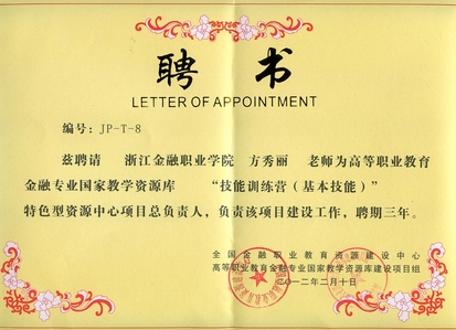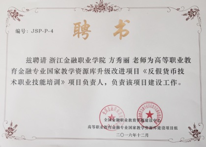 副岗长方秀丽受聘国家教学资源库《反假货币技术职业技能培训》负责人,助力金融专业教学工作。