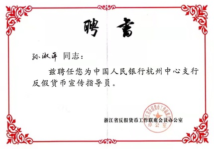 岗员孙淑萍担任人民银行杭州中心支行反假货币指导员。