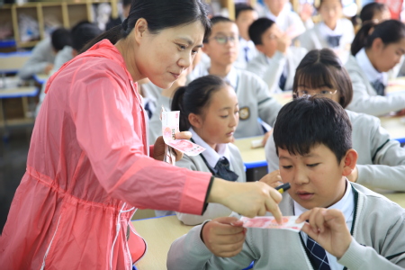 岗员林莉为青海省海西州德令哈第一中学员工传授点钞技能。