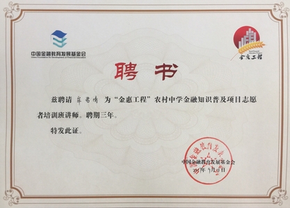 岗员牟君清长期受聘中国金融教育发展基金会“金惠工程”农村中学金融知识普及项目志愿者培训班讲师,服务“金惠工程”农村中学金融知识普及项目。