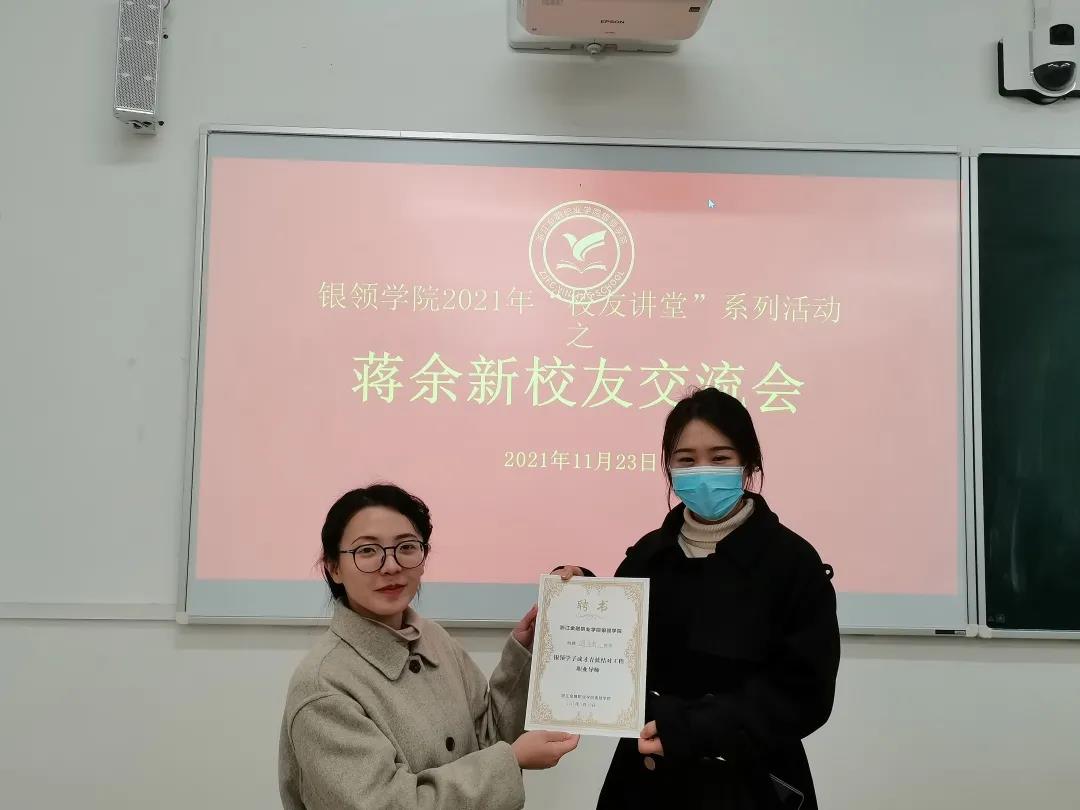 杨斌英老师向蒋余新员工的到来表示热烈的欢迎和由衷的感谢,并为蒋余新员工颁发了《云顶国际vip.888学子成才青蓝结对工程聘书》。