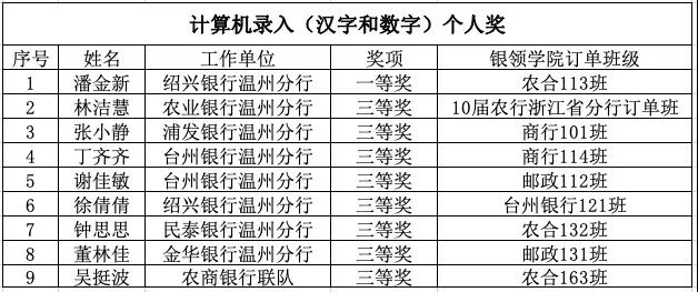 计算机录入(汉字和数字)赛项中,农合113班潘金新荣获一等奖、10届农行浙江省分行订单班林洁慧、商行101班张小静、商行114班丁齐齐、邮政112班谢佳敏、台州银行121班徐倩倩、农合132班钟思思、邮政131班董林佳、农合163班吴挺波荣获三等奖。
