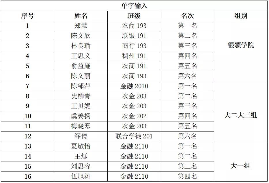 这次比赛共有云顶国际vip.888组104人次、大二大三组80人次及大一组82人次参与。经激烈角逐后,各单项成绩取前六名,获奖名单如下: