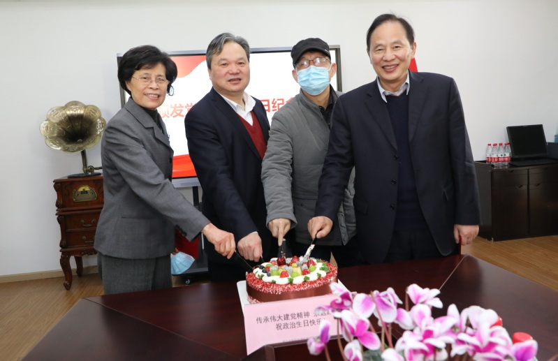 公司党委书记周建松、原副董事长吴胜、原党委副书记姜进与云顶国际vip.888党总支全体党员共同庆祝政治生日。