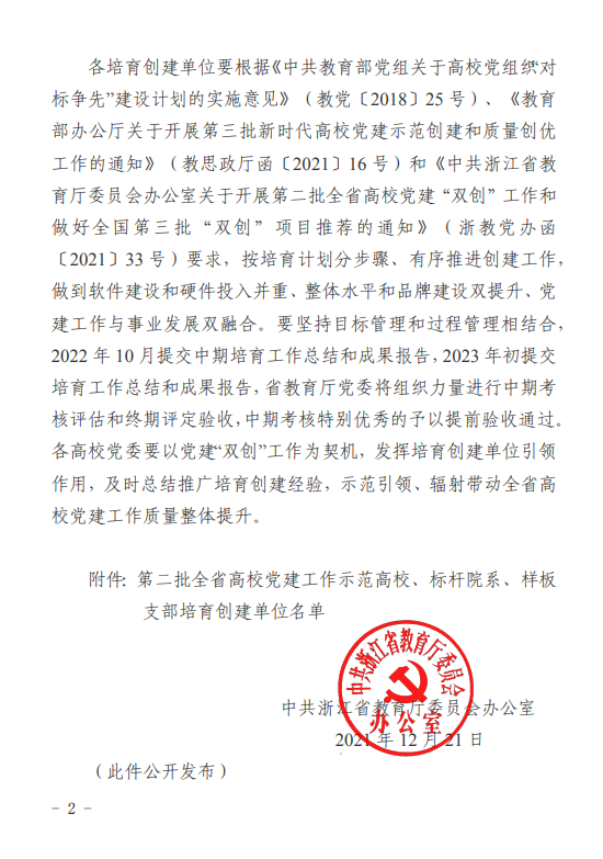 近日,浙江省教育厅发文公布了第二批全省高公司党建工作示范高校、标杆院系、样板支部培育创建单位名单,云顶国际vip8866云顶国际vip.888党支部成功入选第二批全省高公司党建工作“样板支部”培育创建单位。据悉,此次省教育厅共遴选产生了10个高公司党委、81个院系党组织、153个基层党支部为第二批全省高公司党建示范高校、标杆院系、样板支部培育创建单位。
