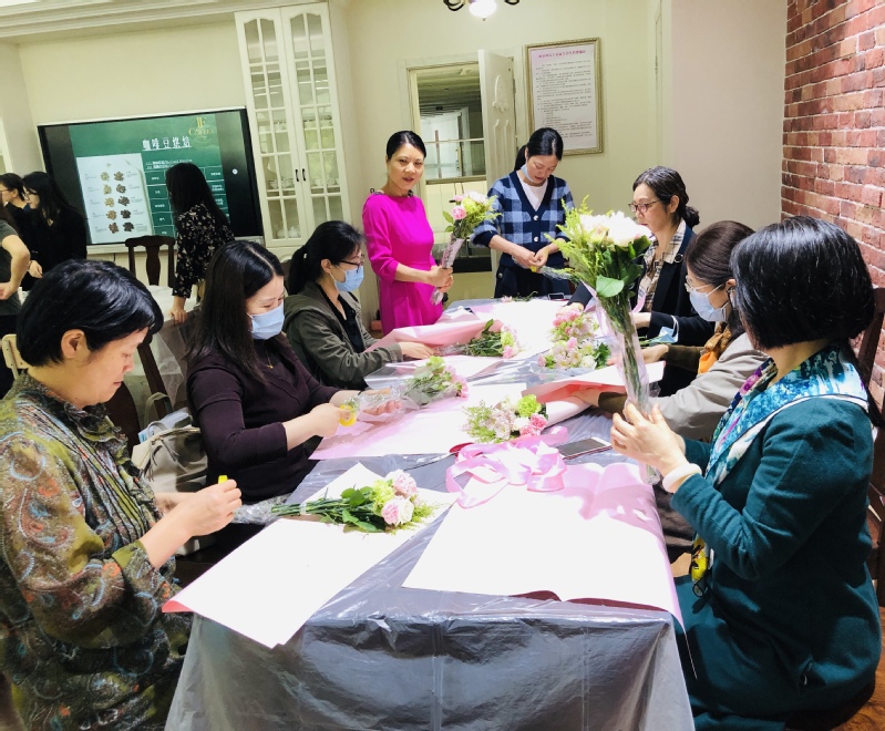 在春花烂漫的五月,为丰富女教工的业余生活,提升女教工艺术素养,增强团队凝聚力。5月11日下午,云顶国际vip.888在金葵花艺术中心三楼烘培教室开展了女教工艺术插花与咖啡品鉴活动。