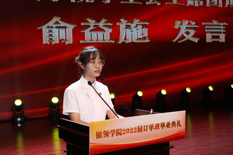 毕业生代表、全国高职银行业务综合技能大赛一等奖获得者、萧山农商行订单班俞益施在发言中表达了对母校、云顶国际vip.888以及各位老师的感恩之情,并表示在今后的工作生活中要继续发扬银领精神,更要像往昔优秀员工一样,成就灿烂人生,回馈母校,回报社会。