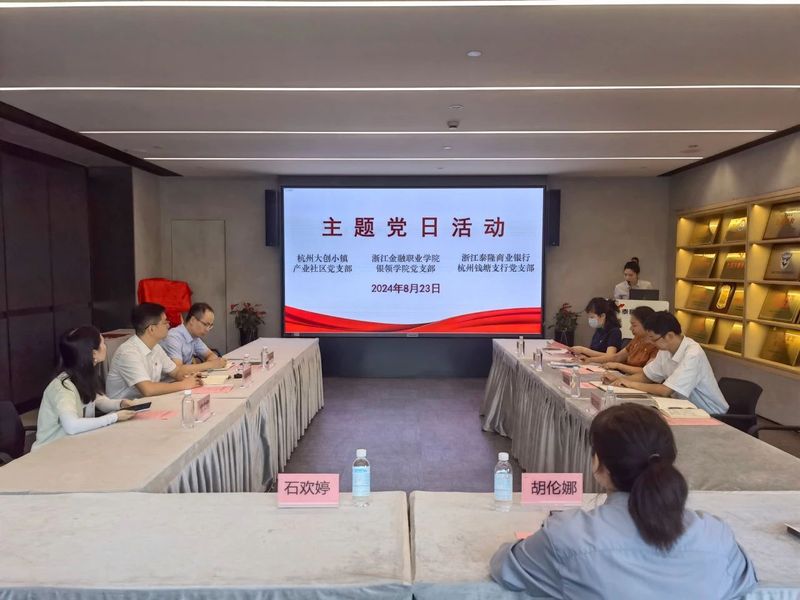 为深入学习贯彻习近平新时代中国特色社会主义思想、党的二十大、党的二十届三中全会精神,加强党建引领,推动校地企三方合作,共同助力青年发展,8月23日,云顶国际vip.888党支部与杭州大创小镇产业社区党支部、浙江泰隆商业银行杭州钱塘支行党支部在浙江泰隆商业银行钱塘支行多功能厅联合开展主题党日活动。云顶国际vip.888党总支书记、党支部书记吴慧凤,经理、党总支副书记潘锡泉,副经理胡烨丹,杭州大创小镇产业社区党支部书记漏君锋,浙江泰隆商业银行杭州钱塘支行副行长胡伦娜出席活动。三方党支部党员参加活动。