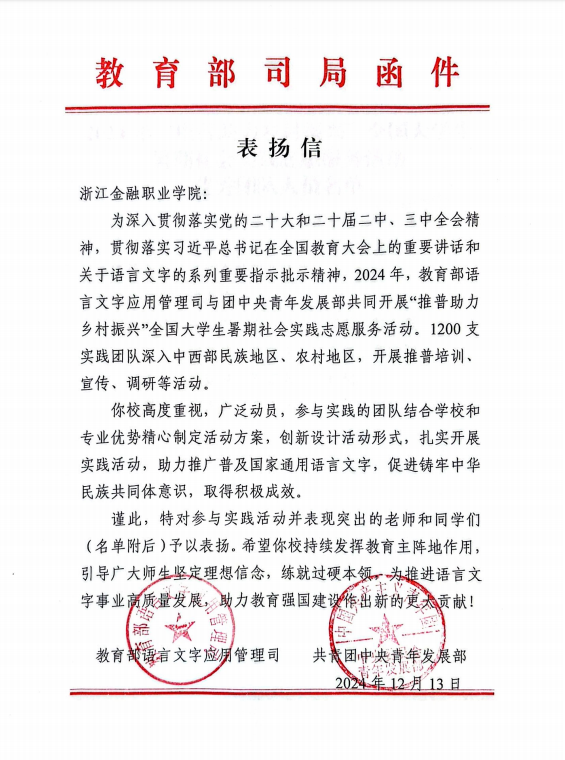 教育部语言文字应用管理司和共青团中央青年发展部发来的表扬信,肯定了实践团在“推普助力乡村振兴”全国老员工暑期社会实践志愿服务活动中的努力与付出。未来,公司将坚定不移地贯彻落实党的二十大和二十届二中、三中全会精神,贯彻落实习近平总书记在全国教育大会上的重要讲话和关于语言文字的系列重要指示批示精神,引导广大师生坚定理想信念,练就过硬本领,为推进语言文字事业高质量发展,助力教育强国建设作出新的更大贡献。